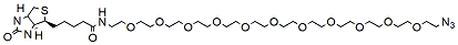 Biotin-PEG11-azide is PEG derivative containing a biotin group and an azide group. The azide group can react with either alkyne moiety in Cu(I)-catalyzed Click Chemistry reaction or DBCO moiety in copper-free Click Chemistry reaction to form a stable triazole linkage. The hydrophilic PEG spacer increases solubility in aqueous media of the molecules conjugated to the biotin compound. It also helps to minimize steric hindrance involved with the binding to avidin molecules.