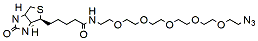 Biotin-PEG5-azide is PEG derivative containing a biotin group and an azide group. The azide group can react with either alkyne moiety in Cu(I)-catalyzed Click Chemistry reaction or DBCO moiety in copper-free Click Chemistry reaction to form a stable triazole linkage. The hydrophilic PEG spacer increases solubility in aqueous media of the molecules conjugated to the biotin compound. It also helps to minimize steric hindrance involved with the binding to avidin molecules.
