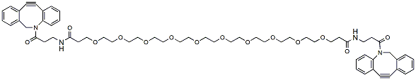 DBCO-PEG10-DBCO is a PEG derivative containing a reactive two DBCO groups and a hydrophilic PEG spacer arm. DBCO will react with azide-bearing compounds or biomolecules to form a stable triazole linkage without copper catalyst. The hydrophilic PEG spacer arm can increase water solubility and membrane permability.
