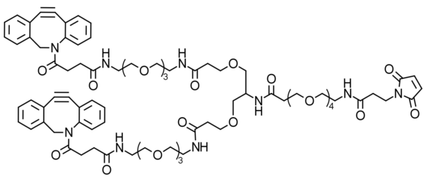 Mal-PEG4-bis-PEG3-DBCO is a click linker for bio-conjugation that contains a terminal maleimide group and two DBCO groups linked through a linear PEG chain.