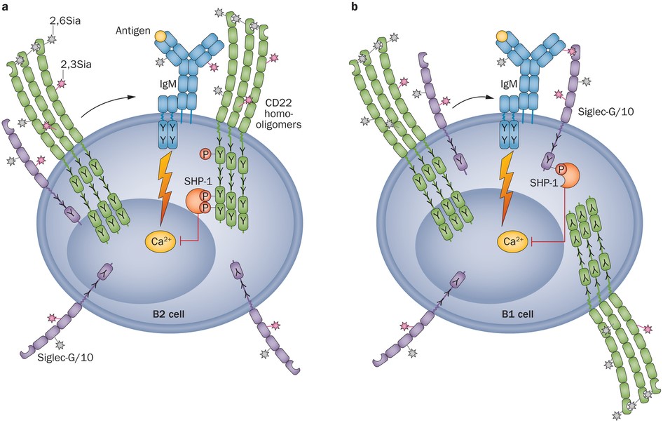 CD22 (cluster of differentiation-22) is a cell surface sialic acid binding Ig-like lectin (SIGLEC2 or SIGLEC-2) that is involved in B-cell and B-cell interactions. It is mainly expressed on mature B cells and it is an immunoglobulin protein that contains six Ig-like C2-type domains and one Ig-like V-type domain in the extracellular portion for ligand binding and four cytoplasmic immunoreceptor tyrosine-based inhibitor motifs (ITIM) for downstream cellular signaling modulations.