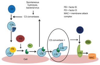 Similar to other secreted serine proteases, the N-terminal signal peptide of CFD is initially cleaved in the secretory pathway, producing an inactive zymogen, proCFD. Its subsequent maturation mainly can classify in two ways. Firstly, the five to six amino acid N-terminal activation domains in humans are quickly cleaved, either via the secretary pathway or soon after its release into plasma, generating 99% of plasma CFD in the CFD rather than proCFD form. Secondly, activation is considered to occur after CFD generation as a result of a conformational change which occurs when it binds C3bB, a complex of factor B, magnesium ions, and complement component 3b (C3b). Then, CFD becomes transiently active and enables to cleave factor B within this complex into Ba and Bb fragments. Additionally, CFD is found to express on pancreatic cancer and renal cancer cells.