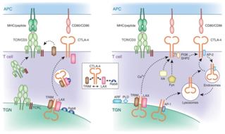 Besides, some studies have proven that CTLA4 binding to B7 may actually form inhibitory signals that counteract the stimulatory signals from CD28:B7 and TCR:MHC binding. There exist some possible mechanisms for such inhibitory signals: inhibition of CD28 or its signaling pathway, direct inhibition at the TCR immune synapse, or improved mobility of T cells causing induced ability to interact with APCs. Additionally, CTLA4 itself is subject to regulation, particularly by localization within the cell. In resting naive T cells it is located mainly in the intracellular compartment. And it is found to expressed in head and neck cancer.