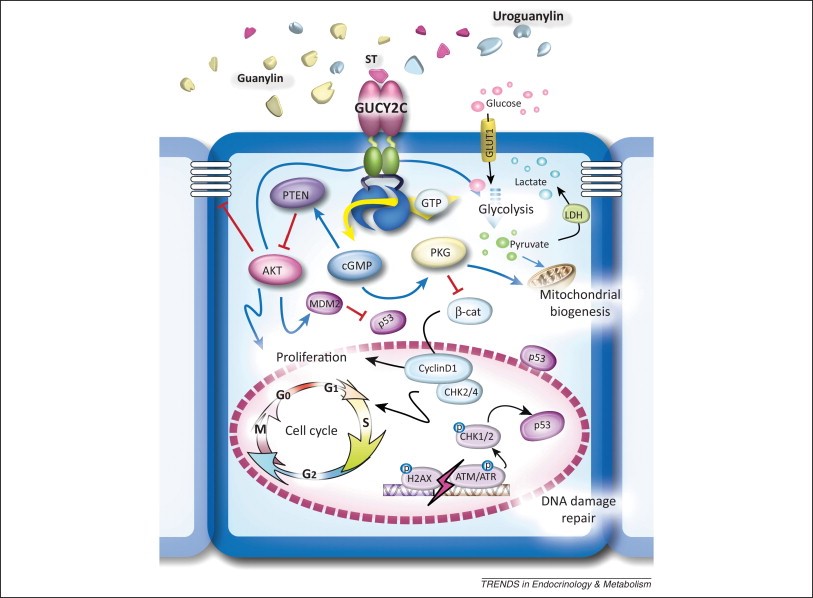 playing an important role in orchestrating intestinal homeostatic mechanisms. These effects are mediated by the endogenous hormones guanylin (GUCA2A) and uroguanylin (GUCA2B), which bind and activate GUCY2C to regulate proliferation, metabolism and barrier function in intestine. Mutations in GUCY2C gene can cause familial diarrhea (autosomal dominant) and meconium ileus (autosomal recessive) and GUCY2C silencing by the near universal loss of its paracrine hormone ligands increases colon cancer susceptibility in animals and humans.