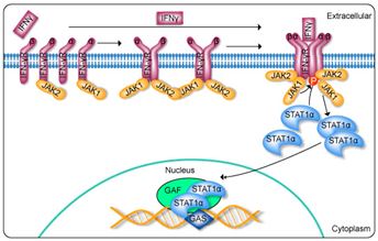 IFNG is the only member of the type II IFN and is more restrictively expressed. Unlike the type I IFNs, IFNG processes its own receptor, comprising of IFNγR1 and IFNγR2 subunits, giving it the special function. Importantly, the biologically active form of IFN-γ is an antiparallel dimer which interacts with the extracellular domain of the receptor subunit IFNγR1. Besides, binding of the ligand engages the IFNγR2 subunit, which is responsible for the intracellular transmission of the signal. In addition, the most important function of IFN-γ is the upregulation of the main histocompatibility (MHC) class I molecules to help in the priming and presentation of antigens in the professional antigen presenting cells.
