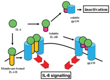 The first one, named "classic" IL-6 signaling, depended on IL-6 binding the membrane IL-6R, which in turn results in dimerization of the second receptor subunit gp130 and initiation of intracellular signaling cascades. Different from gp130, which is found on almost every cell of the body, IL6R is expressed much more restricted with primary hepatocytes and certain leukocyte subtypes bearing IL6R. Signaling through membrane-bound IL6R is rather anti-inflammatory, and has reported being critically related to plasma cell differentiation, the acute phase response, and fever induction. The second one, IL-6 is able to engage a soluble form of the IL6R in solution with the same affinity as the membrane-bound receptor. The resulting binary cytokine complex displays agonistic properties and can activate cells that only express gp130 but lack membrane-bound IL6R.