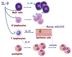 Numerous studies have been shown that IL9 is associated with the progression of various diseases, including Vogt-Koyanagi-Harada disease, primary biliary cirrhosis, immune thrombocytopenia, atopic dermatitis, inflammatory bowel diseases, allergic disorders, and asthma. It has been shown that the patients with ulcerative colitis present the higher IL9 levels than the control person and the IL9 levels correspond with endoscopic inflammation. In addition, IL-9, as an established proinflammatory cytokine, might promote the inflammatory response via increasing the production of IL-17 in VKH disease.