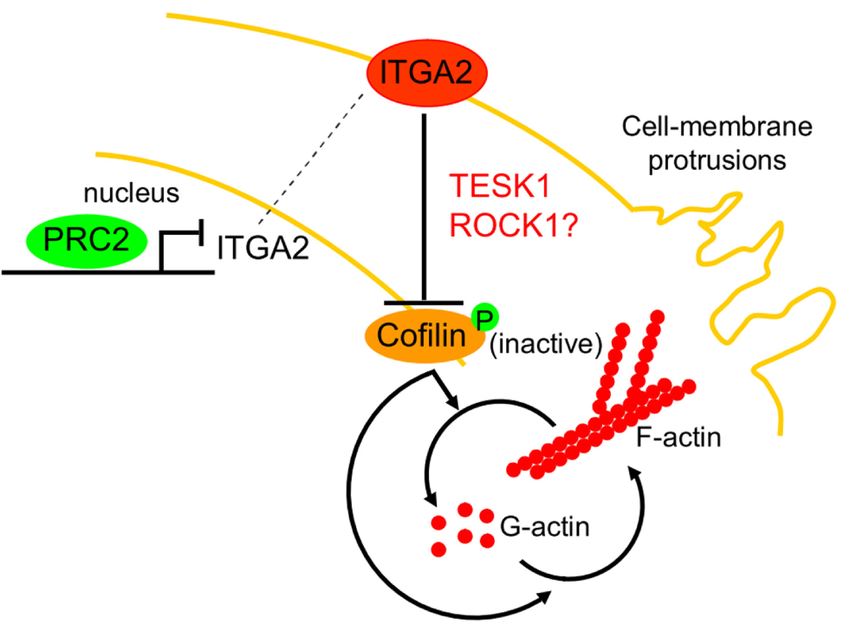 An essential role for ITGA2 in cell migration, invasion, survival and angiogenesis is well established. In general, ITGA2 serves a crucial role in tumour cell invasion, metastasis and angiogenesis, and changed the expression of the receptor has been related to tumour prognosis in a number of solid tumours. Nevertheless, the relationship is complex, with both enhanced and reduced expression associated with different stages of tumour metastases in several tumour types. In addition, ITGA2 has been proven to regulate tumour cell invasion in pancreatic cancer, prostate tumours, and ovarian tumours; along with improved α2 related to decreased survival in melanoma and improved metastasis in colorectal cancer.