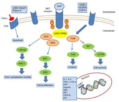 Mesenchymal-epithelial transition (MET), also known as HGFR or AUTS9, is a member of the receptor tyrosine kinase family of proteins, encoded by proto-oncogene MET. The preproprotein is proteolytically processed to produce alpha and beta subunits linked by disulfide bonds, as a result of the production of mature receptor. Functionally, MET involves in oncogenesis and progression of numerous tumors by binding to its ligand, hepatocyte growth factor (HGF), inducing dimerization and activation of the receptor, which plays a key role in cellular survival, embryogenesis, and cellular migration and invasion.