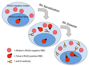 The RhD is specifically expressed in bone marrow and skin. It is proved that RhD plays an essential role in clinical blood transfusion and the pathological processes of some diseases including neonatal hemolysis disease, delayed hemolytic transfusion reaction, autoimmune hemolytic disease. An RhD-negative people who do not produce RhD antigen in one's bloodstream will produce anti-D antibodies when exposed to RhD-positive blood, leading a hemolytic disease. Similarly,the RhD-positive exposure happens during pregnancy when an RhD-positive fetus can transport into RhD-negative mother. And the RhD-negative mother will produce anti-D antibodies which can cross the placenta arrived into the red blood cells of an RhD-positive fetus, thus resulting in hemolytic anemia, and even fetal death.