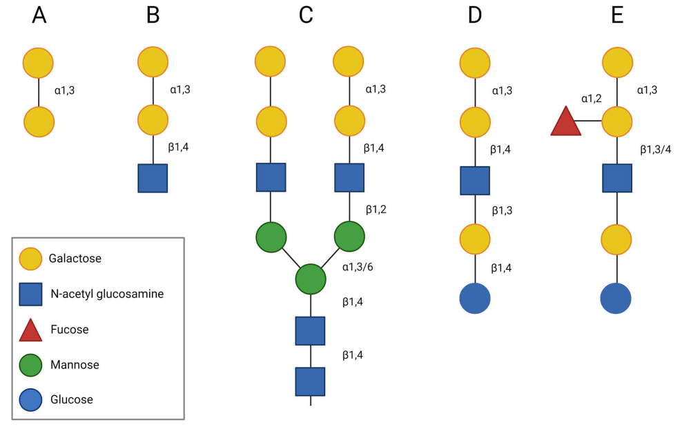 The primary xenoantigens detected by human natural antibodies feature terminal alpha-galactosyl (Galα1-3Gal) epitopes within extended carbohydrate chains attached to diverse proteins and lipids. Most alpha-galactosyl epitopes are synthesized by α1,3GT via galactose transfer from UDP-Gal, creating α(1,3)-glycosidic bonds with glycolipid or glycoprotein acceptors ending in N-acetyllactosamine (LacNAc), Galβ(1,4)GlcNAc.