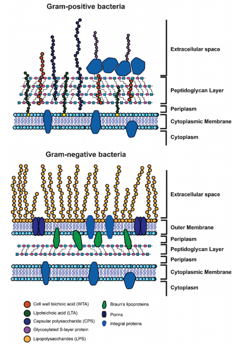 Fig.1 Structural illustration showing gram-positive and gram-negative bacterial cell walls.1,3