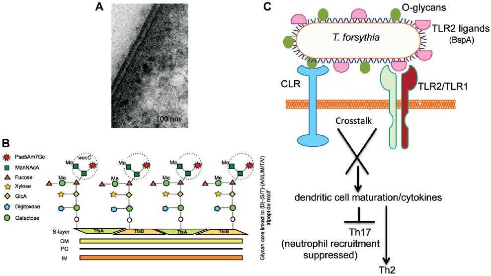 Fig.2 Schematic diagram of the O-glycan core structure linked to a peptide motif in Tannerella surface-layer proteins and signaling crosstalk between a C-type lectin-like receptor (CLR) and TLR2 activated by O-glycans and TLR2 ligands, respectively.1,3