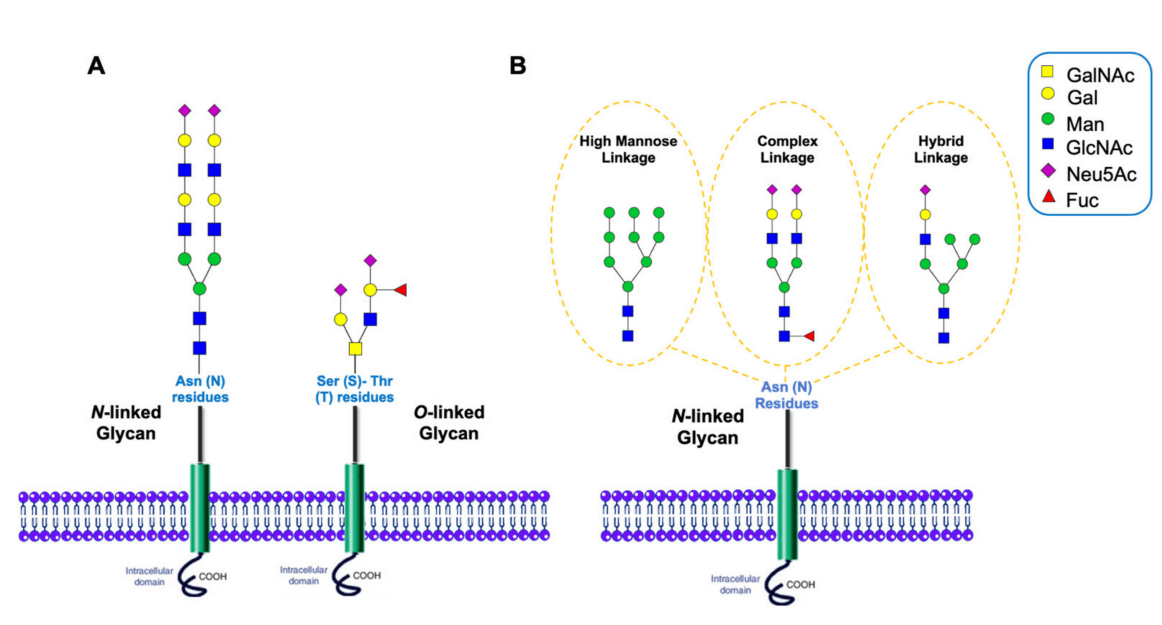 Fig.1 A depiction of the nomenclature, topology, and glycosylation patterns of N- and O-glycans.1, 2
