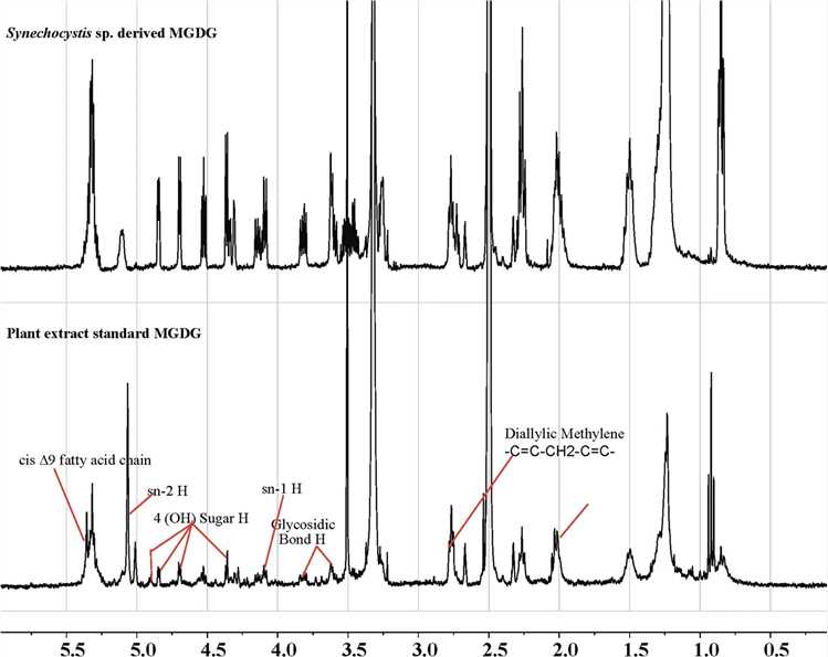 NMR is a powerful tool for verifying MGDG isolation. The following figure shows how NMR analysis confirmed the isolation of MGDG from Synechocystis sp. In the experiment, 1H NMR was used to examine the fractions obtained with 40% chloroform and 60% acetone. The NMR peaks of fraction I matched those of a standard MGDG, proving high purity. NMR analysis successfully confirmed the high-purity extraction of MGDG from the cyanobacterial lipid extract.