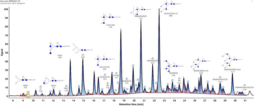 Fig.2 N-glycan profile of VRC01 monoclonal antibody by HILIC-UPLC-FLR-MS analysis.2,3