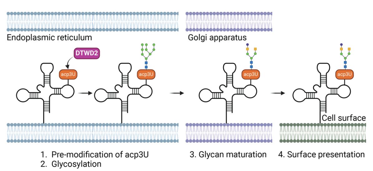 Fig.1 GlycoRNA biosynthesis and surface localization.1