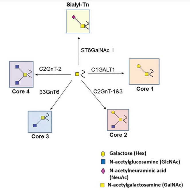 Fig.1 Illustrates enzymatic pathways extending O-glycan structures through biosynthetic enzymes.1,4
