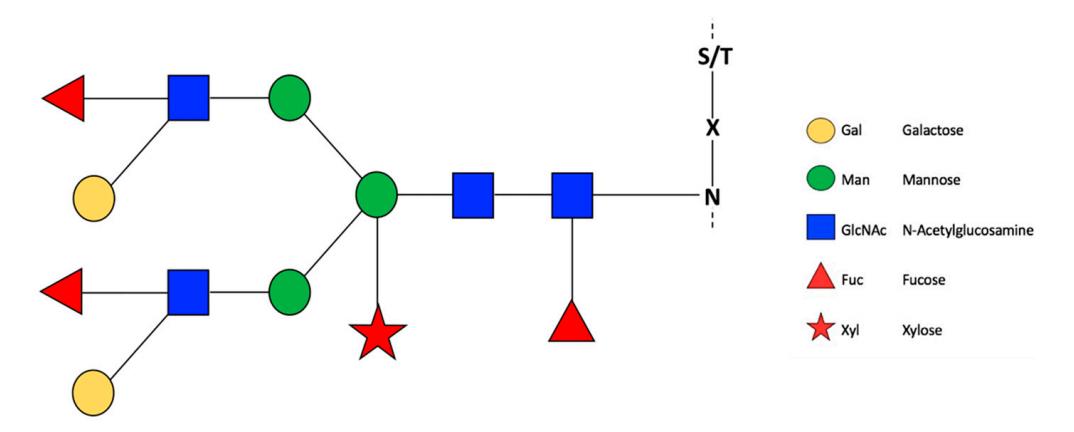 In spite of glycan diversity, most N-glycans are synthesized from a common lipid-linked glycan precursor built of three glucose, nine mannose, and two N-acetylglucosamine. Plant N-glycans are classified into high-mannose and complex-type N-glycans whereas paucimannose N-glycans are a plant-specific subclass of complex-type N-glycans. High-mannose N-glycans are composed of 2-6 mannose residues that are linked to the trimannosyl core. Complex-type plant N-glycans lack β1,4-galactose, N-acetylneuraminic (sialic) acid and core α1,6-linked fucose. Paucimannose-type N-glycans are unique for invertebrates and plants. This kind of glycans possess only a core α1,3-fucose and/or β1,2-xylose and lack terminal GlcNAc residues or larger antennae linked to the Man3-2GlcNAc2 core.