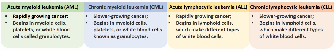 Leukemia is a generic term for cancers of the bone marrow and lymphatic system. Leukemia is the most common disease in adults over 55 years old, while it is also the most often cancer in children under 15 years old. There are four main types of leukemia, each named for the rate at which the disease progresses and worsens as well as the blood cell type affected.