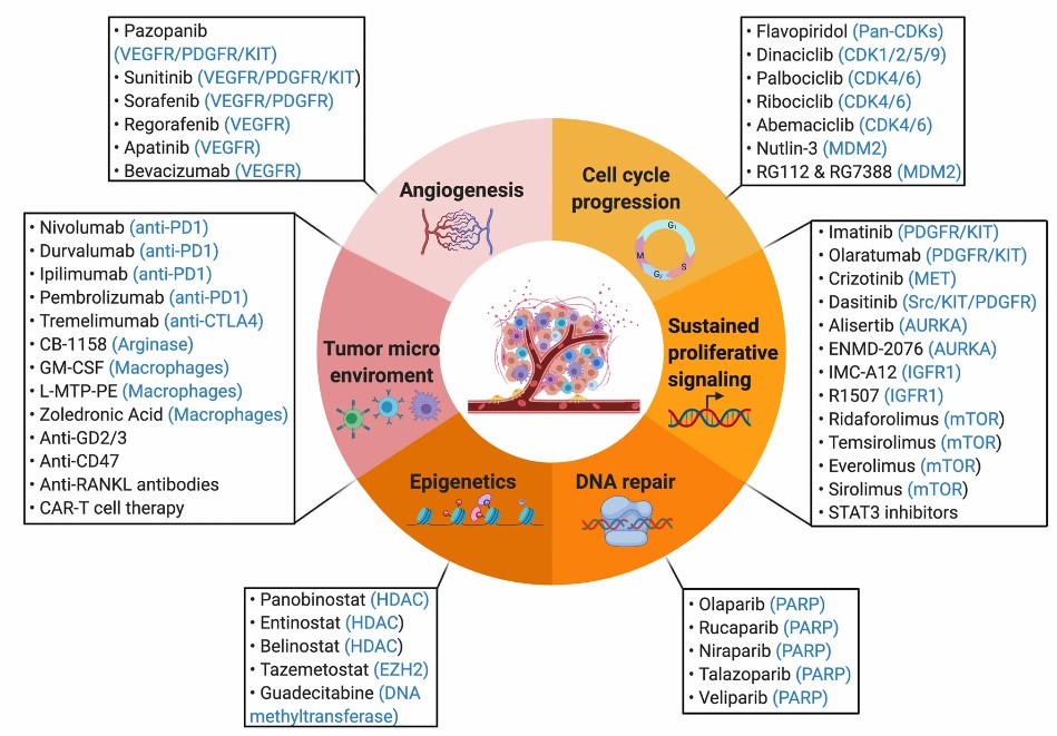 Fig.1 Approved drugs and the respective targets for sarcomas treatment. (Damerell, et al., 2021)