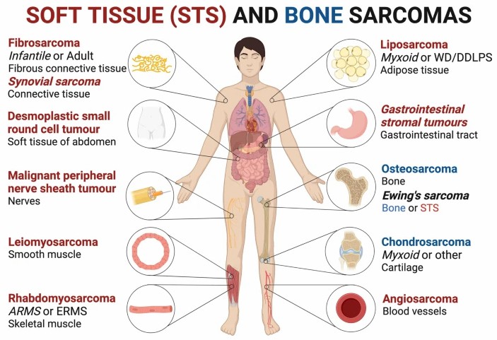 Fig.3 Schematic representation of the most frequently occurring soft tissue and bone sarcomas. (Damerell, et al., 2021)