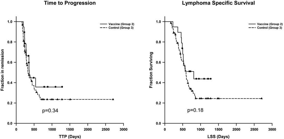 Fig.4 Comparison of vaccinated Group 2 to control Group 3 for time-to-progression (TTP) and lymphoma-specific survival (LSS). (Sorenmo, et al., 2011)
