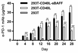 The following are the results of primary human B cells engineered with α-PD-1 antibody.
