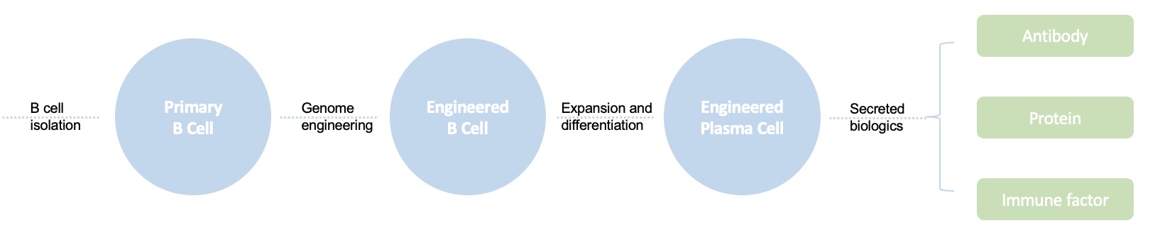 Plasma B cells have the unique ability to secrete high levels of protein and have the potential to be used as protein-replacement-engineered cell therapies. Biologic antibody drugs are used to treat many diseases, including viruses, cancers, autoimmune diseases, and protein deficiencies.
