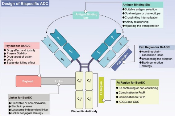 A prospective way to address these clinical challenges consists of the conjugation of bispecific antibodies (BsAbs) with linker-cytotoxic payload complexes, which has led to the creation of bispecific antibody-drug conjugates (BsADCs). Compared to traditional ADCs, BsADCs have a unique dual epitope/target binding mode that can not only bind with co-expressed antigens in solid tumors to enhance selectivity, but also significantly improve internalization. These unique advantages make BsADCs a significant force in the next generation of ADCs. Currently, more than 10 different BsADCs are being tested in clinical trials. The design of BsADCs is not just “1+1=2”, but it involves a comprehensive harmonizing and optimizing of BsAbs, linkers, and cytotoxic payloads where the change in binding modes influences the overall therapeutic effect.