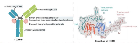 ZW49 is based on Zanidatamab, using the interchain disulfide bond cysteine and protease cleavable linker to couple N-acylsulfonamide auristatin, making it well-tolerated. The bispecific antibody properties of ZW49 contribute to better internalization, and its Fc region imparts ADCC, ADCP, and CDC effects. This design addresses several unmet clinical needs of HER2-expressing patients. Preclinical data showed that ZW49 exhibited a strong tumoricidal effect and good tolerance without compromising HER2 affinity. Currently, ZW49 is undergoing Phase I clinical trials. As of September 2022, disclosed clinical trial data show that the objective response rate (ORR) in patients with HER2-expressing advanced solid tumors is 31%, and its ocular toxicity feature (corneal keratitis as 42%) is notable.
