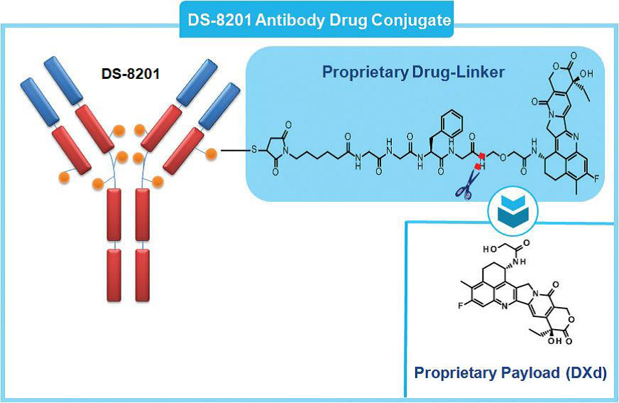 DS-8201 is an ADC drug that connects the humanized monoclonal antibody trastuzumab targeting HER2 and a novel topoisomerase 1 inhibitor, exatecan derivatives (DX-8951 derivatives, DXd) by a peptide linker to target the delivery of cytotoxic agents into cancer cells, which reduces systemic exposure of cytotoxic agents compared to conventional chemotherapy. Currently, DS-8201 is being developed for the treatment of various types of cancer, including breast cancer, stomach cancer, colorectal cancer, and bladder cancer.