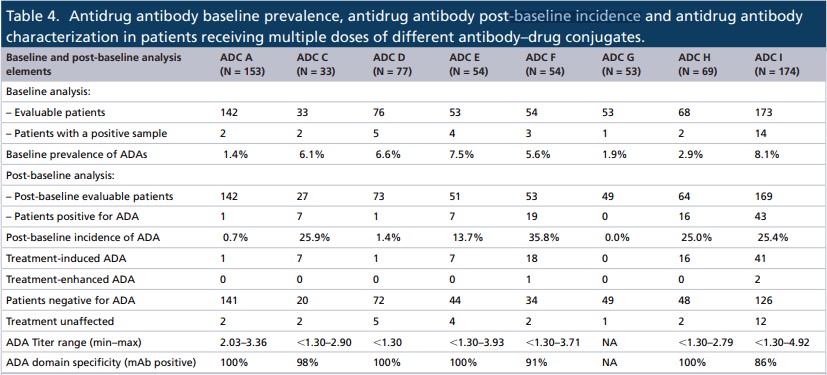 Immunogenicity is an important part of the clinical characteristics of protein drugs, of which the data should be evaluated in the context of other factors such as efficacy, competition, and safety. Here we focus on the three ADCs, F, H, and I, with a high number of patients producing ADA, with 19, 16, and 43 post-baseline ADA positive patients, respectively.