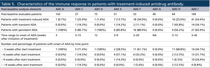 It showed that the time of occurrence of treatment-induced ADA was variable in all ADCs, usually between 3 and 42 weeks. In addition, 6 of the 8 ADCs developed ADAs in more than 60% of patients within 3 to 6 weeks after treatment.