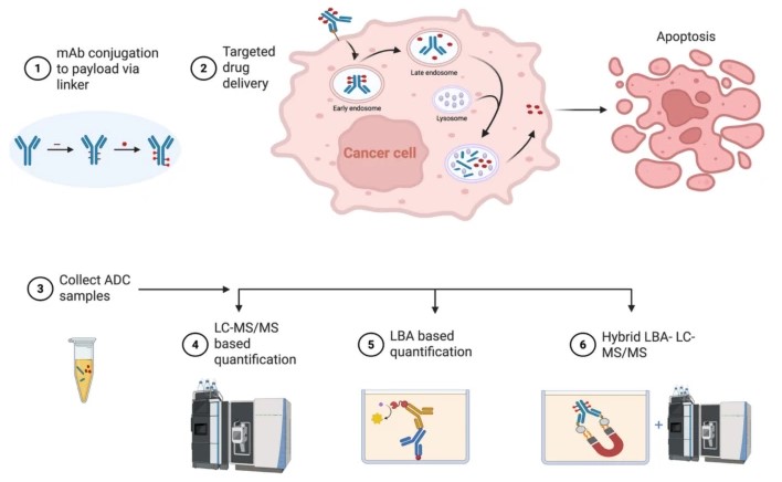 Fig.1 Schematic of antibody-drug conjugate cellular mechanisms and quantification bioanalytical strategies.1