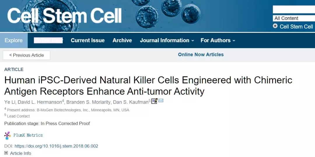- Ye Li, David L. Hermanson 4, Branden S. Moriarity, et al. Human iPSC-Derived Natural Killer Cells Engineered with Chimeric Antigen Receptors Enhance Anti-tumor Activity, Cell Stem Cell (2018)