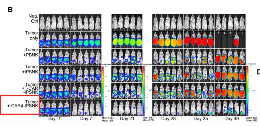Therefore, the researchers found an NK92 cell born without this switch. Based on it, the chimeric antigen receptor CAR4 that specifically recognizes tumors is loaded to further enhance the ability to recognize and kill cancer cells. In this way, with the NK92 cells differentiated by iPSC and the carefully selected CAR4, the NK-CAR-iPSC-NK cells (CAR-NK cells for short) are eventually accomplished.
