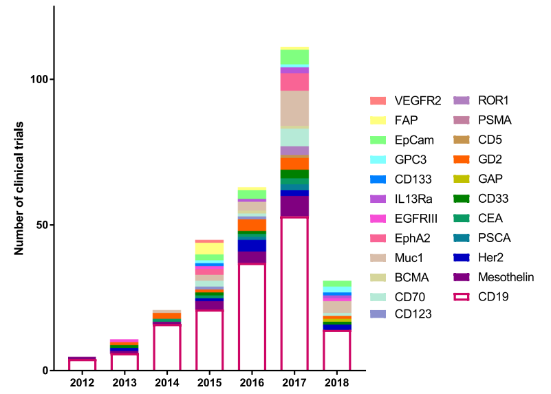 In 2012, there were a total of 5 clinical trials, four targeting CD19 and one targeting Mesothelin. This number has continued to grow and the number of biomarkers tested in a clinical setting has also expanded from 2 to 25. There were more clinical trials than any previous year in 2017 with 111 initiated, targeting 17 different biomarkers. This growth demonstrates not only the efficacy of CAR T therapy, but also the huge push in immunotherapy to find new and better targets.