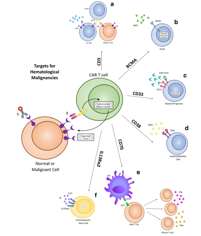 Despite the high levels of complete response rates in patients, relapse from CD19 CAR therapy can occur via a suppressive tumor microenvironment or antigen escape. Based on this, new targets are being identified and evaluated to treat hematological malignancies, including CD5, IL3Rα (CD123), CD33, CD70, CD38, and BCMA. These same targets have already shown promise using drug-conjugated antibodies, and several have been approved by FDA for treatment. These biomarkers are now being evaluated as targets for adoptive T cell CAR therapy to treat hematological malignancies.