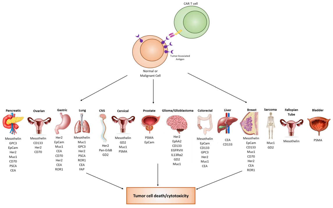 While CAR T cell therapy has been very successful against hematological malignancies, it has been challenging to apply this technology to solid tumors. This challenge has resulted in a strong effort to discover biomarkers for solid malignancies. There are 17 biomarkers currently in clinical trials for solid tumors. Over 14 different organ types are currently being targeted using a variety of different biomarkers. Many biomarker targets are expressed in several different cancer types.