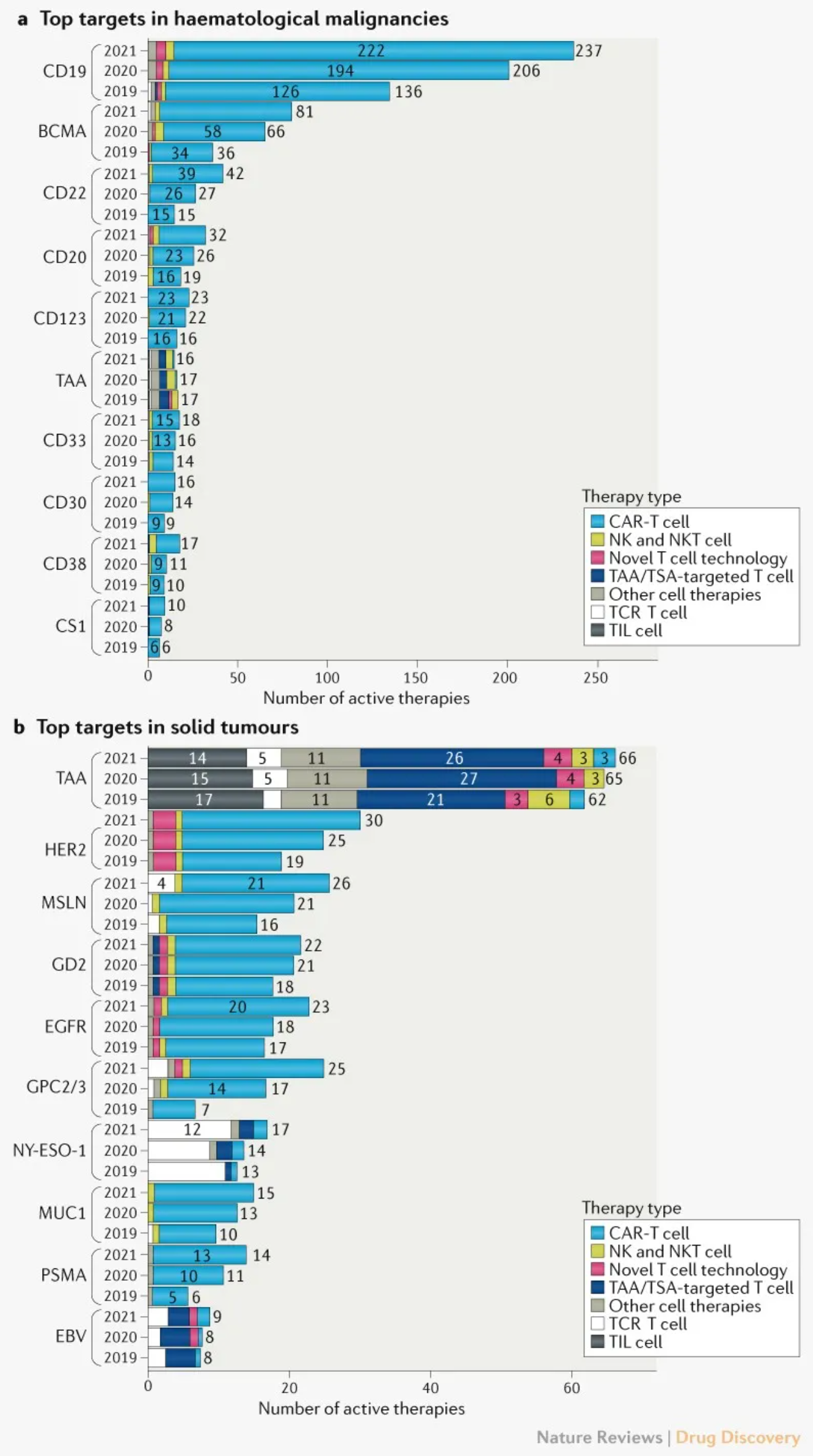 Analysis of the targets and pathways of cell therapy showed that CD19, BCMA, and CD22 are still the main targets of hematoma, but the number of drugs targeting these targets increased significantly in the past year compared with the previous year (51%, 83% and 80%, respectively). The increase in the past year was 15%, 23% and 56%, respectively. The reasons for the sharp decline in the number of targeted drugs year-on-year may include market saturation and the impact of COVID-19 on drug research and development.