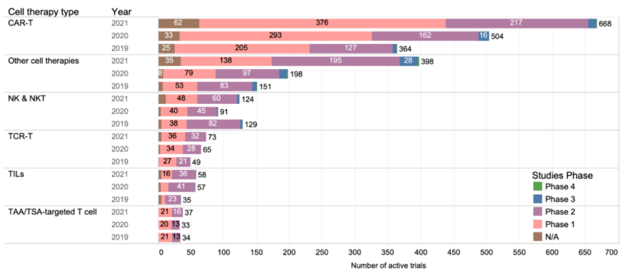 According to data provided by ClinicalTrials.gov, there were 1358 cell therapy trials in the active state as of April 2021, an increase of 43% from 2020 to 2021 compared with 24% growth from 2019 to 2020. Much of this increase is due to CAR-T cell clinical trials, which have increased by 83% since the 2019 update, and more trials have tested other cell therapies, TCR-T cell therapy and TIL (tumor-infiltrating lymphocyte) cell therapy. However, the number of NK/NKT cells has decreased and not fully recovered.