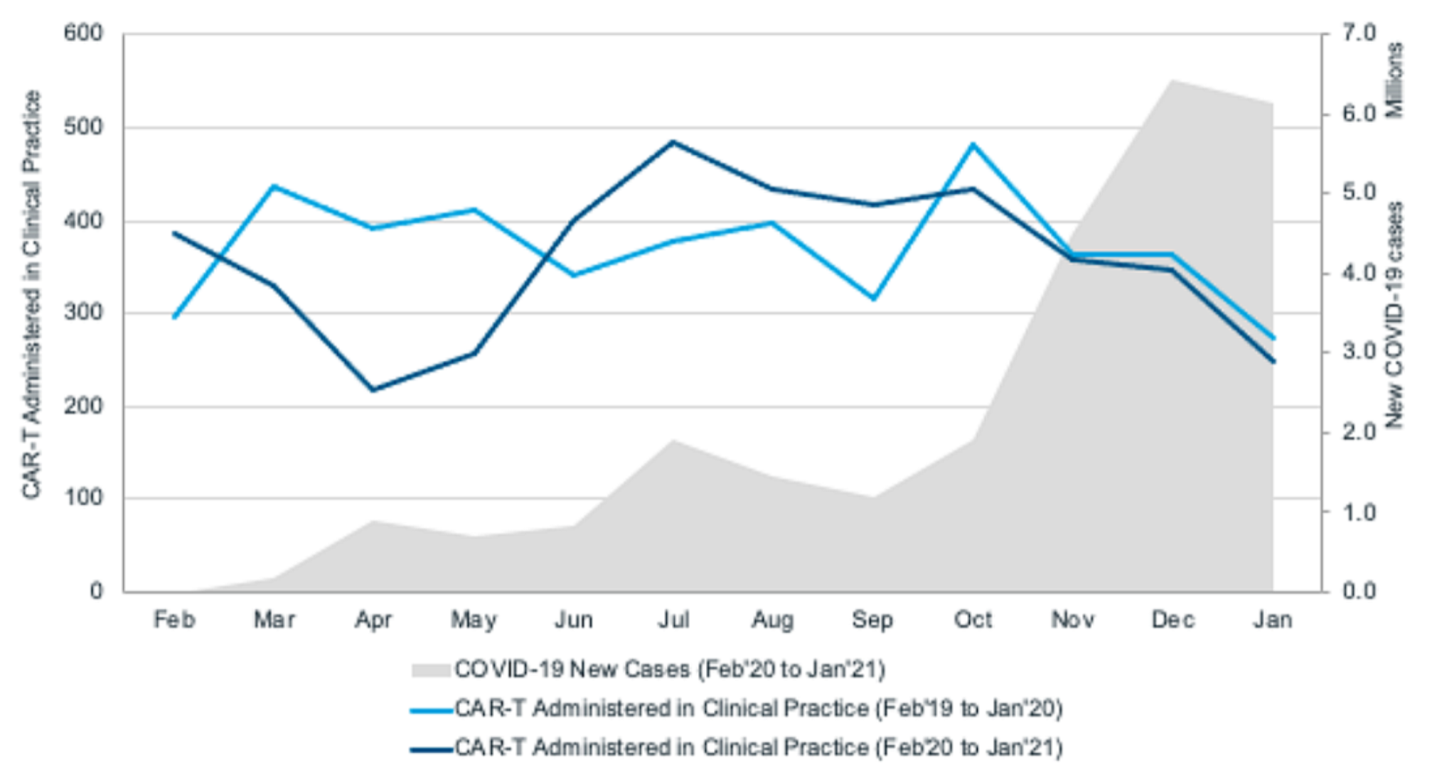A significant decline was found in the number of patients receiving CAR-T cell therapy between March and April 2020, which coincided with the first wave of COVID-19 outbreaks in the United States. This may reflect the instability of the health care system in the early stages of the COVID-19 outbreak, reduced personnel and resources to support CAR-T cell therapy-related procedures, and the reluctance of patients with refractory diseases and medical staff to expose to potentially high-risk hospital environments.