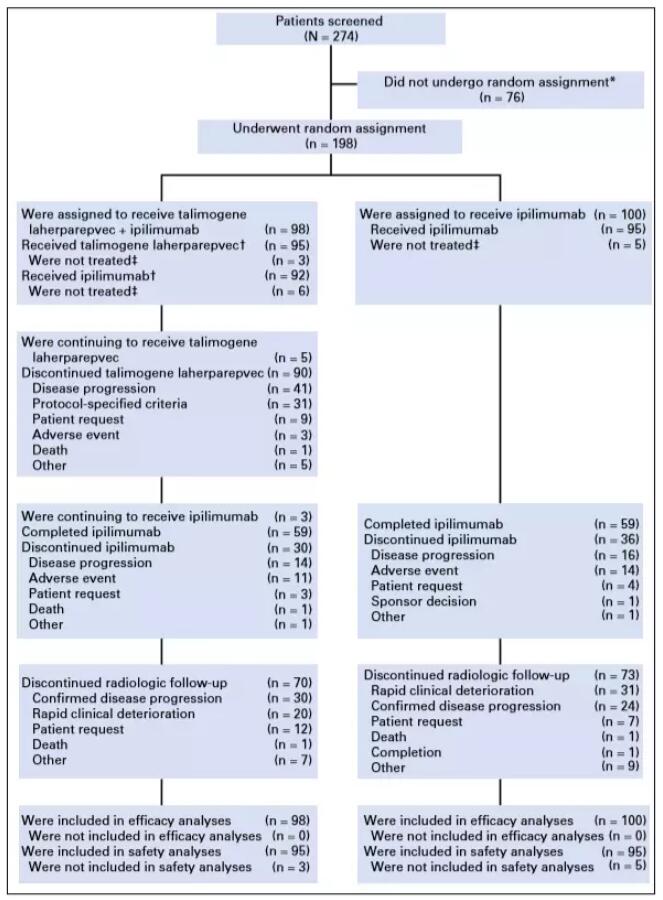 Patients were randomly allocated to the combination therapy group (T-VEC + ipilimumab) and the Ipilimumab group on a 1:1 basis. In the combination group, T-VEC was started in the first week (<=4ml x 10^6 PFU/ml for the first dose and <=4mlx10^8PFU/ml every two weeks after 3 weeks), and in the 6th week Ipilimumab (3 mg/kg once every 3 weeks) was administered 4 times. In the Ipilimumab group, Ipilimumab (3 mg/ml once every 3 weeks) was used in the first week of treatment and administered 4 times. The primary clinical indicator was the objective response rate (ORR) assessed according to the immune-related response criteria.