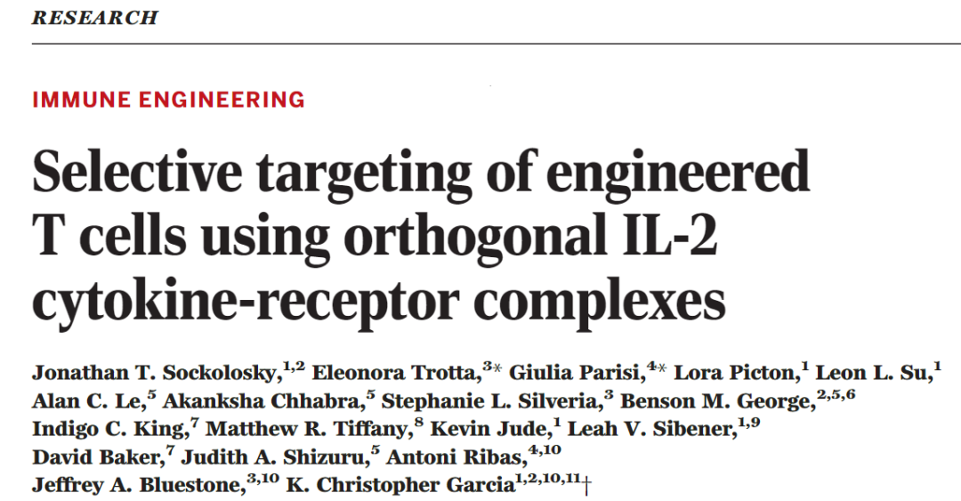 2. Sockolosky, Jonathan T., et al. “Selective targeting of engineered T cells using orthogonal IL-2 cytokine-receptor complexes.” Science 359.6379 (2018): 1037-1042.