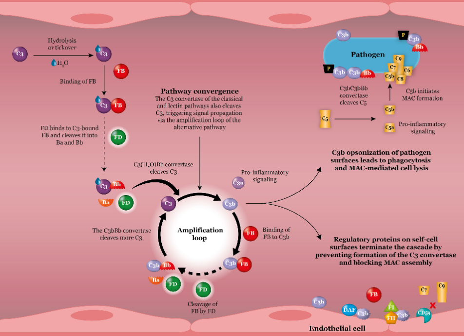 In the alternative pathway, the natural cleavage product of C3, C3b, binds to factor B and then is cleaved by factor D, generating C3 convertase, which can further cleave C3 to produce C3b, which in turn can continue to generate C3 convertase under the action of factors B and D. The cycle continues in this way, forming an amplification loop that rapidly amplifies complement signaling. The amplification loop produces a large number of C3b and C3 converting enzymes binding to form C5 convertase, the enzyme can further cleave C5 to produce C5b, C5b, and other complement proteins binding to form a large number of MAC, and ultimately lead to the rupture of erythrocytes in the blood vessels, the occurrence of intravascular hemolysis.