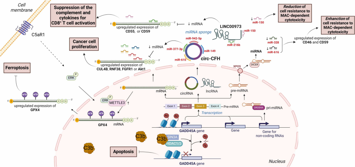 - Non-coding RNAs like circ-CFH modulating miRNA availability to upregulate oncogenes