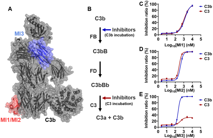 By adding model molecules at different steps of the complement cascade reaction, the model molecules produced different inhibitory effects. The model molecule MI1/2 inhibited C3 cleavage when added at different reaction steps, whereas the model molecule MI3 produced C3 cleavage inhibitory activity only by inhibiting the step at which C3b binds to FB. Through a series of biochemical assays, the team revealed: