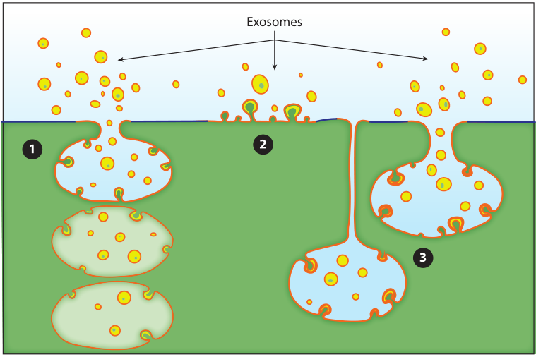Figure 2: Three modes of budding of exosomes. Exosomes bud out into discrete endosomes through vesicles to release exosomes by fusion with the plasma membrane①, or directly from vesicle budding on the plasma membrane②, in addition, they can also connect compartments by shrinking the intracellular plasma membrane The junction of the exosomes delays the release of exosomes③.