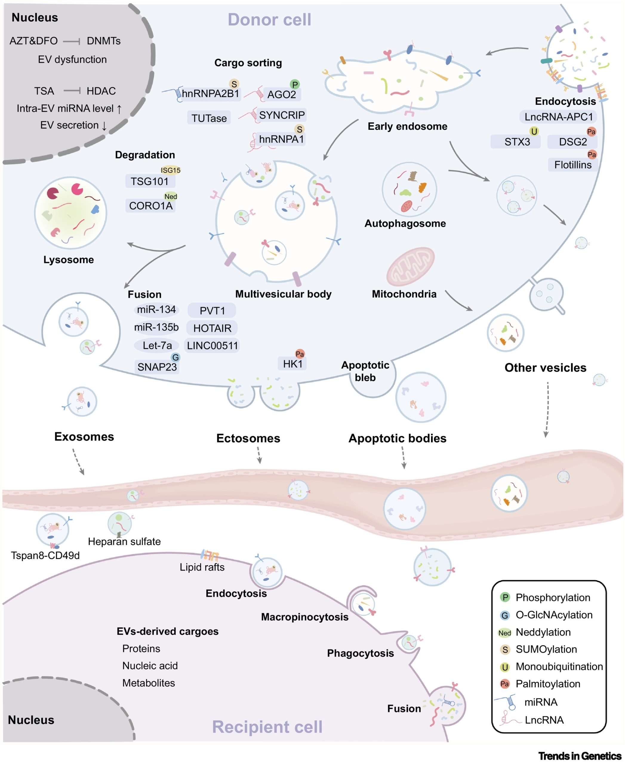 In order to accurately transmit information, the biogenesis of small extracellular vesicles (sEVs), cargo sorting, and uptake by recipient cells are precisely regulated by multiple mechanisms, such as histone and DNA modifications, post-translational modifications of non-coding RNAs, and proteins. (Figure 1).